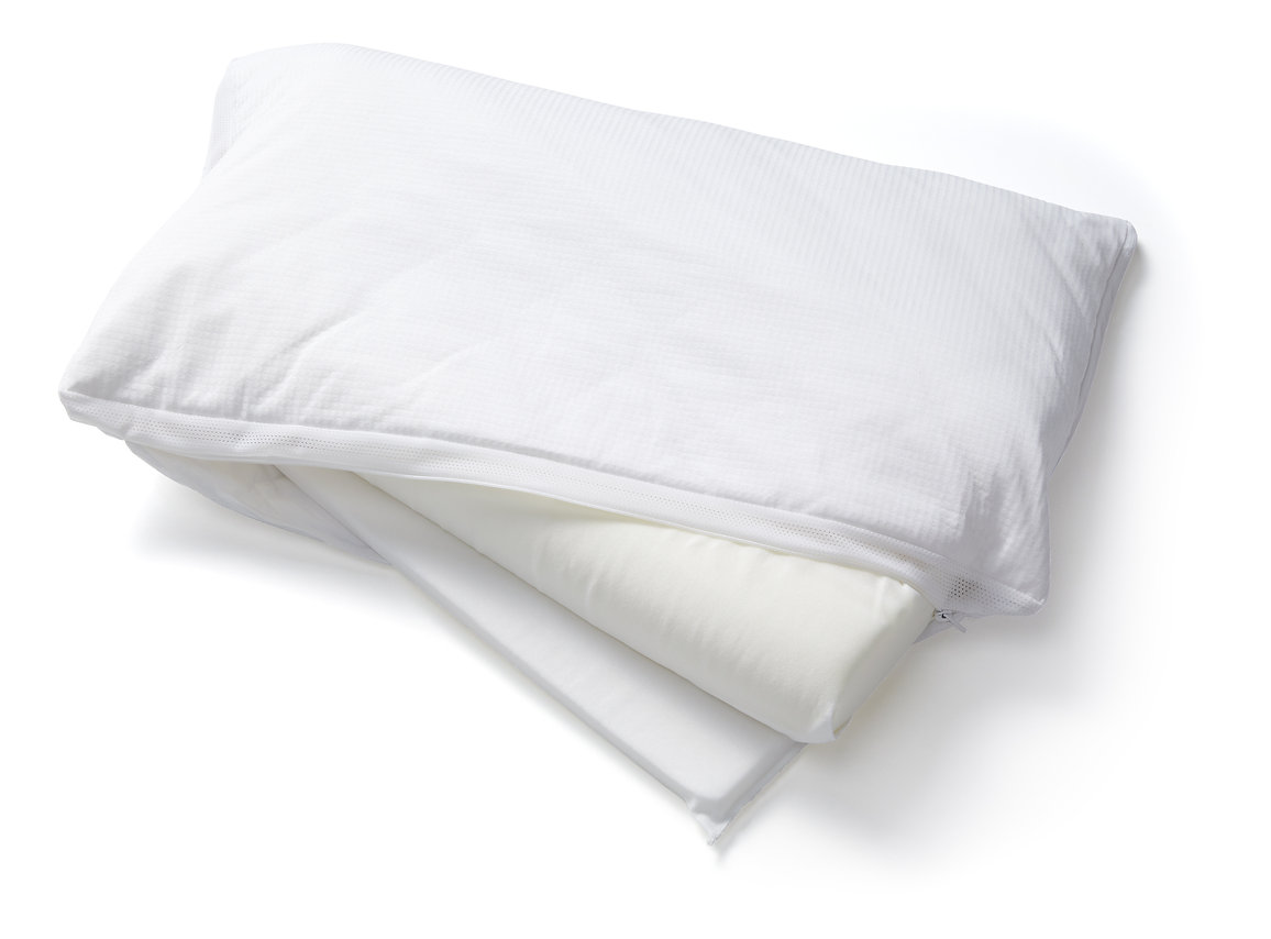 Viscoelastischer Spezialschaum/ Formkern mit Zusatzeinlage inkl. Aussparung zur Nackenentlastung in Rückenlage + 3cm Visco-Keil zur allfälligen Anpassung des Neigungswinkels des Kopfes.